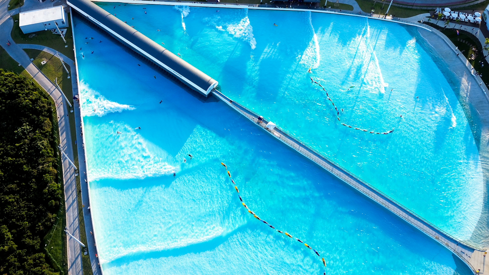 The park uses Wavegarden Cove technology with precision electric motors and hydrofoils that move water efficiently.
